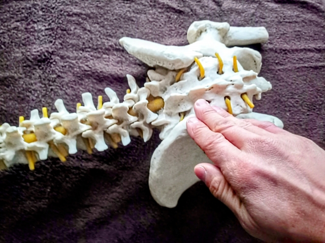 脊柱は積み木のように骨が重なり、また骨と骨の間には椎間板と呼ばれるクッション材があります。