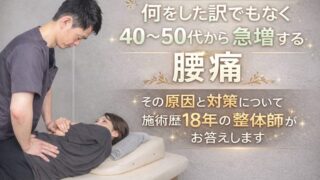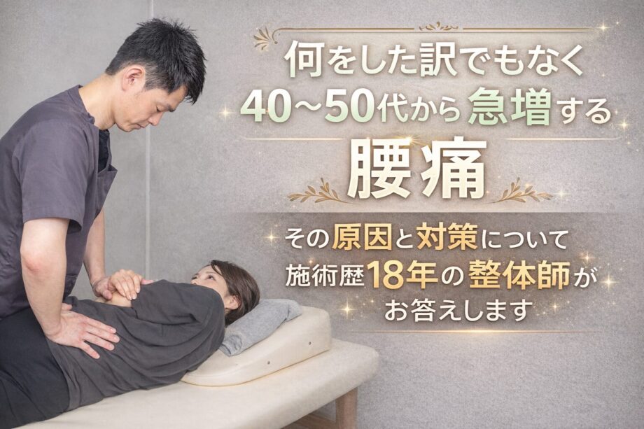 何をした訳でもなく40代~50代にかけて急増する腰痛。その原因と対策について施術歴18年の整体師がお答えします