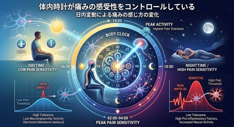 概日リズムと痛みの関係を総説した文献では、サーカディアンリズムの乱れが痛みの閾値を直接変えるという複数の証拠が示されています。